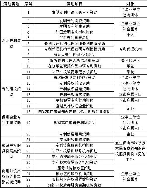 根据《佛山市人民政府办公室关于印发佛山市专利资助办法的通知》(佛府办〔2013〕14号)、《佛山市人民政府办公室关于印发佛山市专利资助办法补充规定的通知》(佛府办〔2014〕44号)和《佛山市人民政府办公室关于印发佛山市促进知识产权服务业集聚发展资助试行办法的通知》(佛府办〔2016〕12号),现就开展2016年度专利资助申报工作有关事项通知如下: