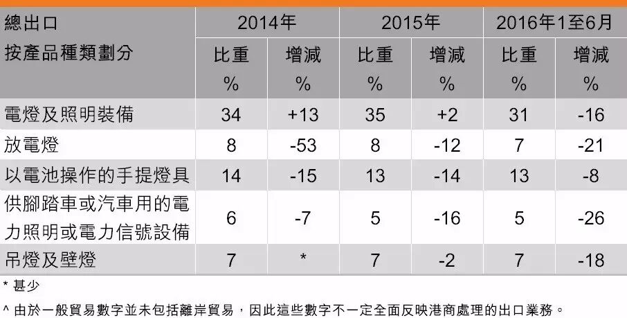2016年上半年,香港照明产品总出口按年下跌12%。主要产品、包括电灯及照明装备、放电灯及以电池操作的手提灯具等出口均呈下跌。
