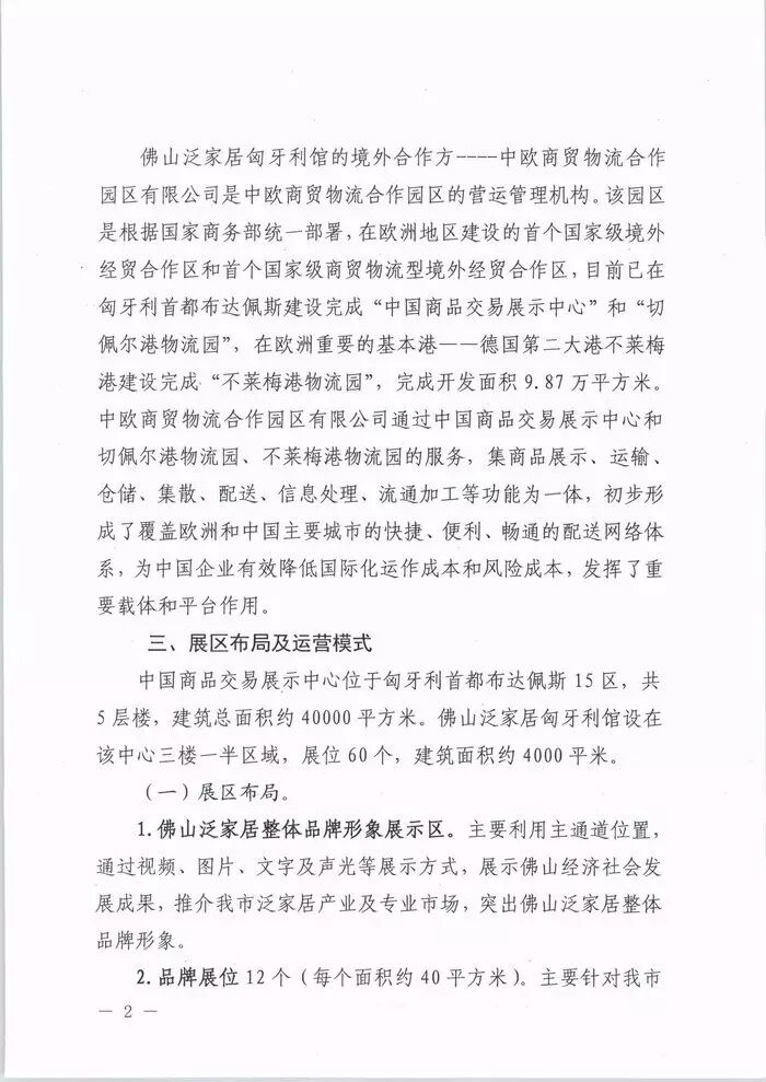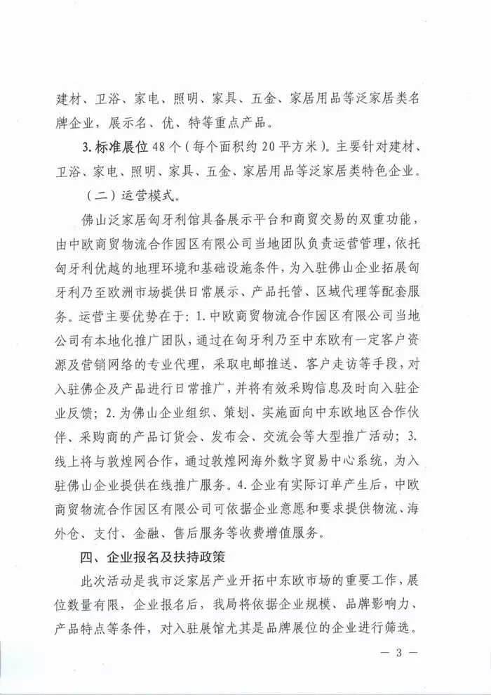 为进一步推动我市泛家居产品开拓匈牙利及中东欧市场,提升我市泛家居品牌在中东欧国家和地区影响力,提高佛山制造国际市场份额,市商务局拟与中欧商贸物流合作园区有限公司合作,在匈牙利首都布达佩斯设立佛山泛家居品牌产品(匈牙利)展示体验馆。现就有关事宜通知如下: