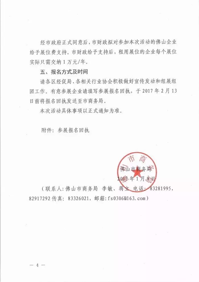 此次活动是我市泛家居产业开拓中东欧市场的重要工作,展位数量有限,企业报名后,市商务局将依据企业规模、品牌影响力、产品特点等条件,对入驻展馆尤其是品牌展位的企业进行筛选。经市政府正式同意后,市财政拟对参加本次活动的佛山企业给予展位费支持。市财政给予支持后,租用展位的企业每个展位实际只需交纳1万元/年。