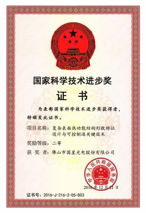 1月9日,2016年度国家科学技术奖励大会在北京人民大会堂隆重举行。国星光电凭借参与完成的“复杂表面热功能结构形貌特征设计与可控制造关键技术”项目荣国家科学技术进步二等奖,站上了国家科技的最高领奖台!