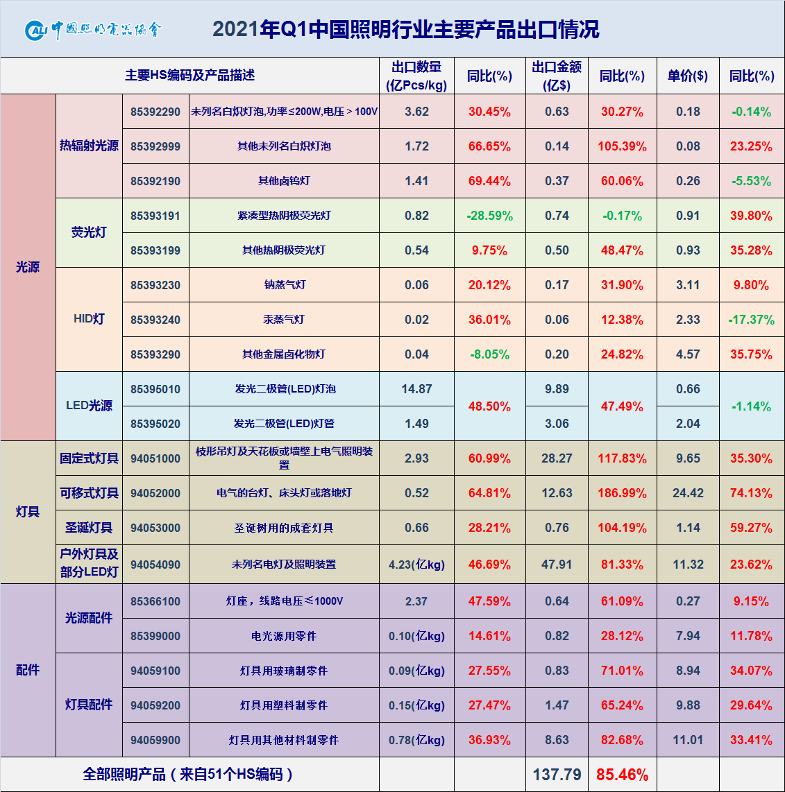 2021年一季度,中国照明产品出口总额为137.79亿美元,同比增长达85.46%,比2019年一季度增长43.29%。其中LED照明产品出口额98.25亿美元,同比增长达102.66%,比2019年一季度增长51.15%。照明产品出口总额和LED照明产品出口额两项均创造照明行业一季度出口的历史新高。